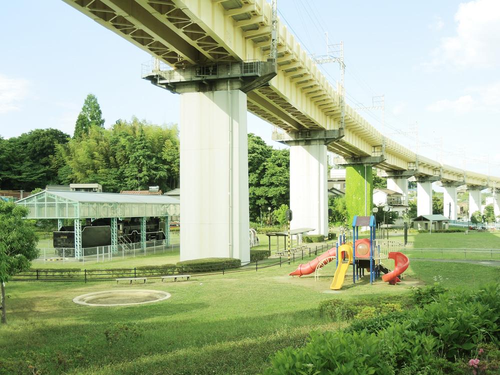 栗山近隣公園は市役所前の京成線線路の高架下にあり、中央に芝生広場、自然石を使った流れ、周りの斜面には市の花であるアジサイが植栽されています。